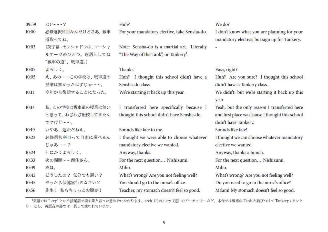 本書があれば、英語版では「"西住殿"は"ミス・ニシズミ"なのか!」「アンコウダンスと雪の進軍の歌詞の英訳を知らないと俺死ぬかも!」「あの決勝戦前、クックファンでカツカツ言ってるとんカツ駄洒落シーンは英語だとどうなってる?」「え、英語だと"ルノーB1bis"とは言わないの!?」など、どうでもいい些細なことに、たくさんの答えを得ることが出来るでしょう!